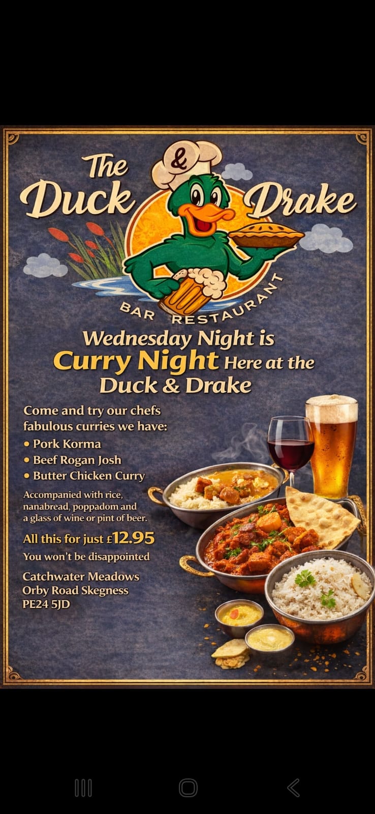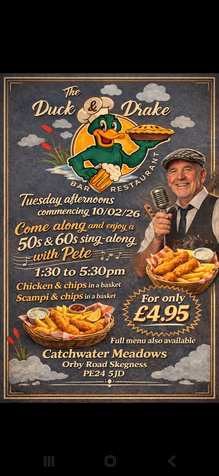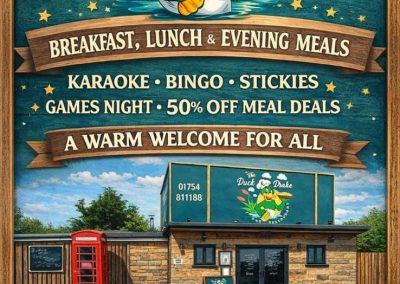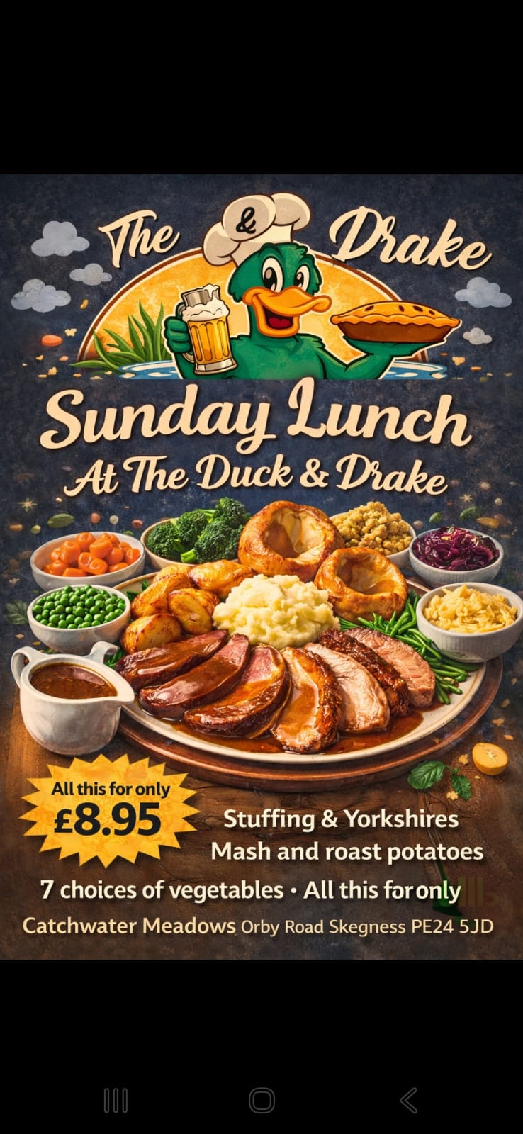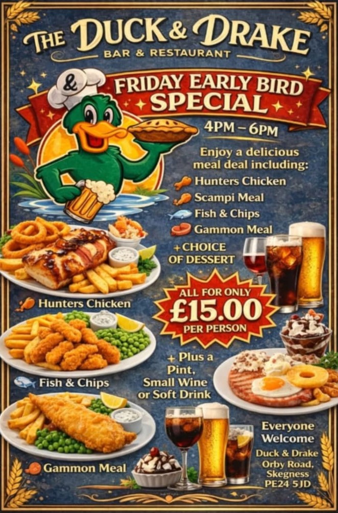 “Came to The Duck & Drake Skegness today for lunch, friendly staff, good selection of drinks. Had a delicious lunch, that was beautifully presented. I had Salmon with Hollandaise sauce on the side…Real Chips!! Salad and coleslaw. Extremely reasonably priced. In fact downright inexpensive. Unbelievable quality and value for money, A definite must visit“