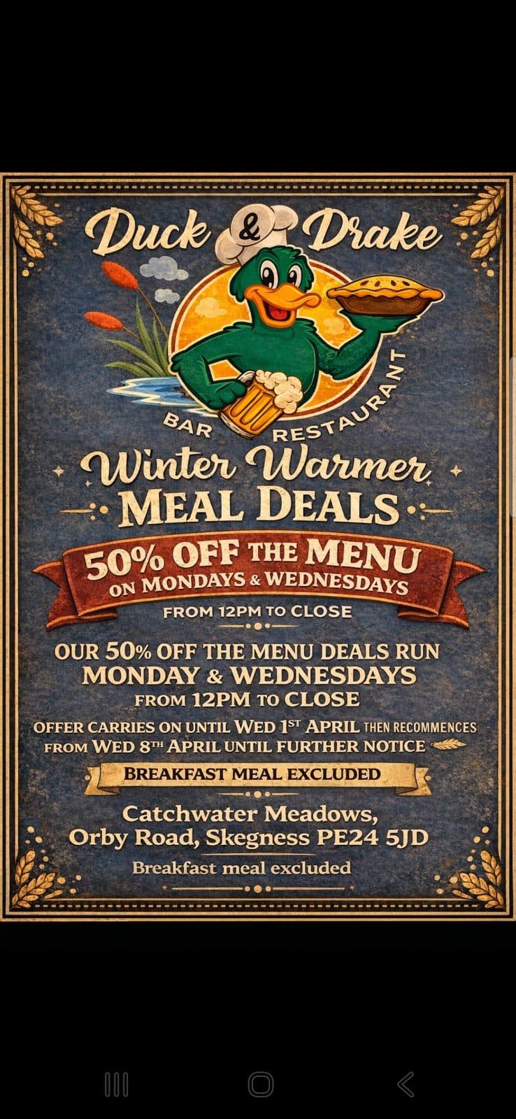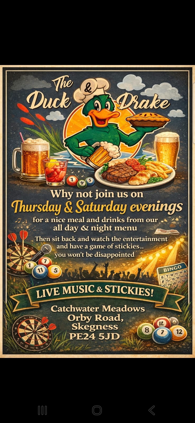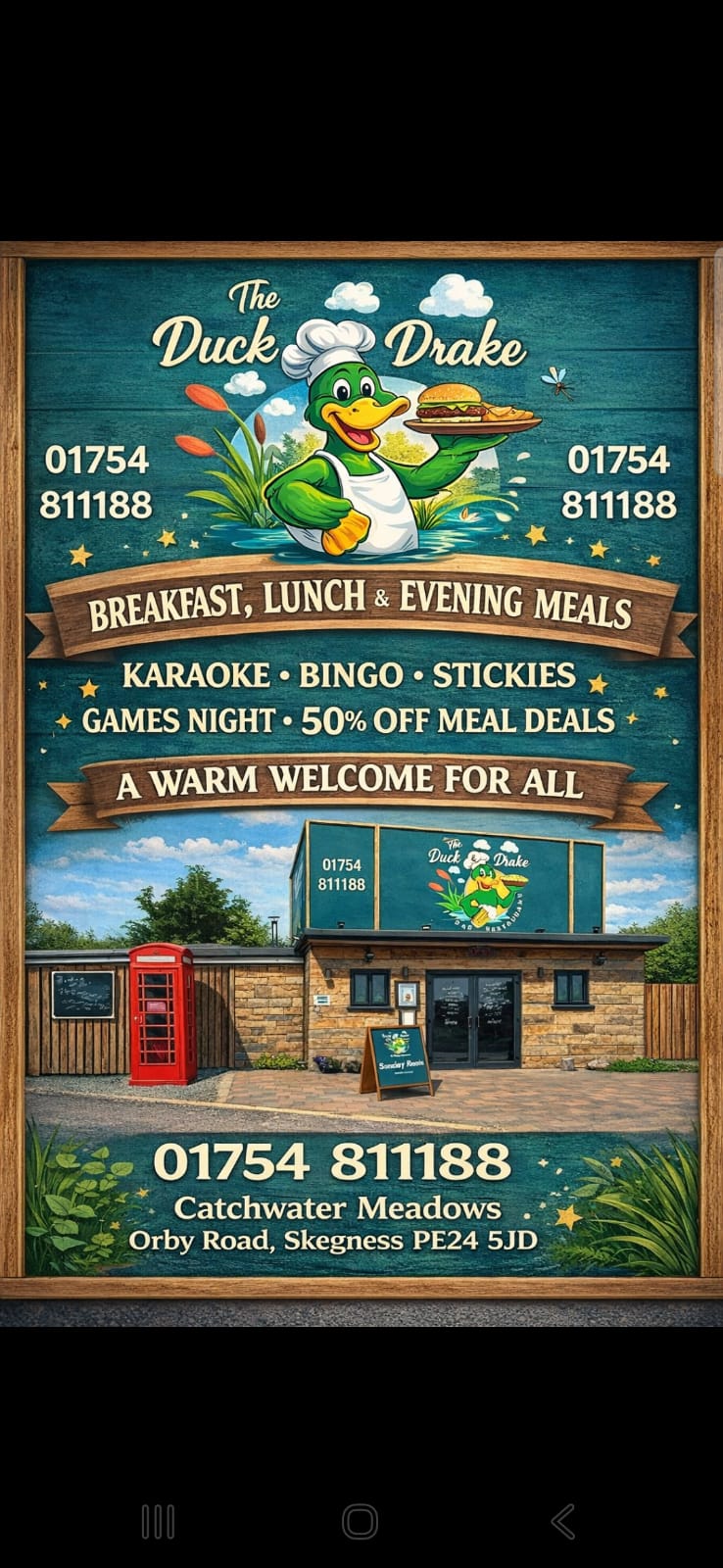 “Came to The Duck & Drake Skegness today for lunch, friendly staff, good selection of drinks. Had a delicious lunch, that was beautifully presented. I had Salmon with Hollandaise sauce on the side…Real Chips!! Salad and coleslaw. Extremely reasonably priced. In fact downright inexpensive. Unbelievable quality and value for money, A definite must visit“