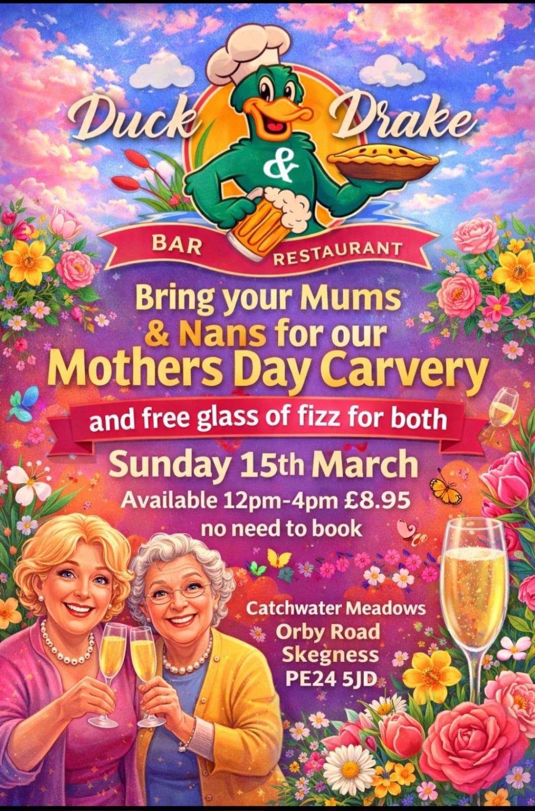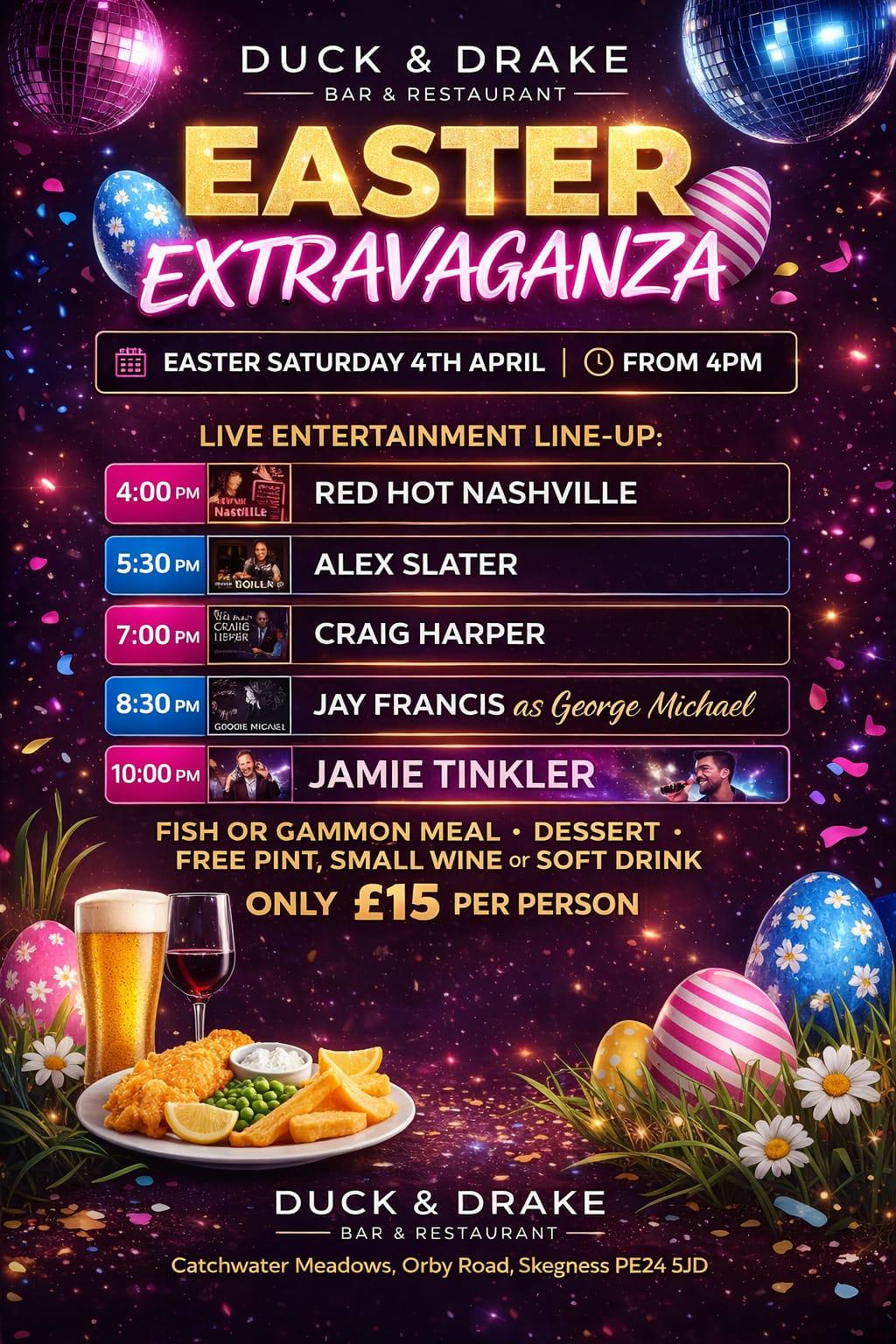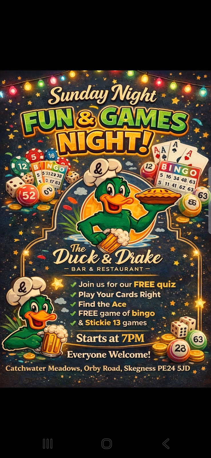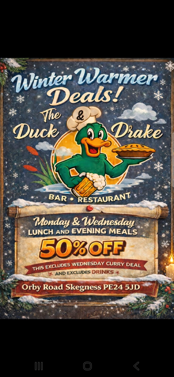 “Came to The Duck & Drake Skegness today for lunch, friendly staff, good selection of drinks. Had a delicious lunch, that was beautifully presented. I had Salmon with Hollandaise sauce on the side…Real Chips!! Salad and coleslaw. Extremely reasonably priced. In fact downright inexpensive. Unbelievable quality and value for money, A definite must visit“